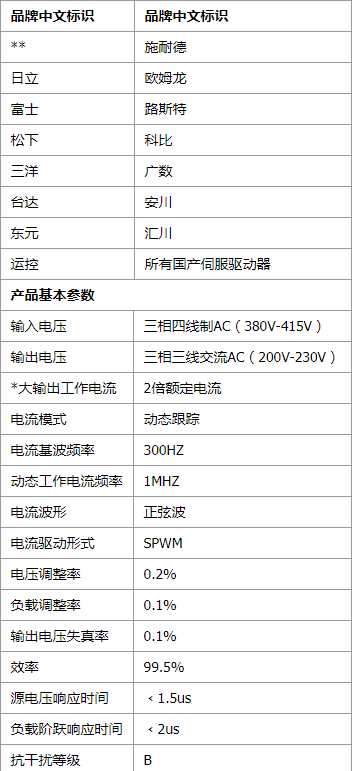 伺服電子變壓器,專門針對中國電網(wǎng)與伺服電機(jī)系統(tǒng),而開發(fā)的電子變壓器,該產(chǎn)品改變了傳統(tǒng)線圈式變壓器體積大笨重,發(fā)熱,耗電,安裝難的問題。電子變壓器采用*前沿的微波器件,三相全橋開關(guān)諧波技術(shù),SPWM調(diào)制方式,開關(guān)頻率1MHZ,所以發(fā)熱量小,無需散熱器,耗電少,完全消除EMI干擾。 產(chǎn)品特性: 1. 鋁合金外形,可任意懸掛安裝,使用簡單 2. 性能穩(wěn)定,耗電少,高穩(wěn)定,抗干擾,不發(fā)熱de 3. 抗雷擊、抗高壓高硫、內(nèi)部電路過壓,過流,短路保護(hù) 4. 全部元件采用進(jìn)口德國,日本功率模塊,國內(nèi)封裝組成,可防水,防油。 5. 特殊的合金材料,接頭端子緩流,緩壓 6. 可匹配以下伺服電機(jī)驅(qū)動(dòng)器 品牌中文標(biāo)識(shí) 品牌中文標(biāo)識(shí) ** 施耐德 日立 歐姆龍 富士 路斯特 松下 科比 三洋 廣數(shù) 臺(tái)達(dá) 安川 東元 匯川 運(yùn)控 所有國產(chǎn)伺服驅(qū)動(dòng)器 產(chǎn)品性能參數(shù) 輸入電壓 三相四線制380V AC 輸出電壓 三相三線交流200-220V AC *大輸出工作電流 2倍額定電流 電流模式 動(dòng)態(tài)跟蹤 電流基波頻率 300HZ 動(dòng)態(tài)工作電流頻率 1MHZ 電流波形 正弦波 電流驅(qū)動(dòng)形式 SPWM 電壓調(diào)整率 0.2% 負(fù)載調(diào)整率 0.1% 輸出電壓失真率 0.1% 效率 99.5% 源電壓響應(yīng)時(shí)間 ﹤1.5us 負(fù)載階躍響應(yīng)時(shí)間 ﹤2us 抗干擾等級 B 產(chǎn)品型號: 序號 型號 功率 匹配電機(jī)功率:變壓器功率一般在伺服上面放大1.5倍,例如,2KW伺服配3KW變壓器,4KW伺服配6KW變壓器。接線方法: 電子變壓器電源輸入 (三相AC380V-415V) R 火線 S 火線 T 火線 N 零線 電子變壓器電源輸出 (3相AC200-220V) L1