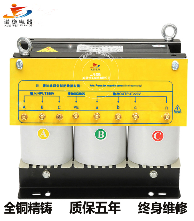 2、輸入、輸出三相電源線,應(yīng)按變壓器接線板母線顏色:黃、綠、紅分別接A相、B相、C相,中性零線應(yīng)與變壓器的中性零線相接,接地線與變壓器外殼(變壓器帶有外殼,應(yīng)與香體標(biāo)志對(duì)應(yīng))。